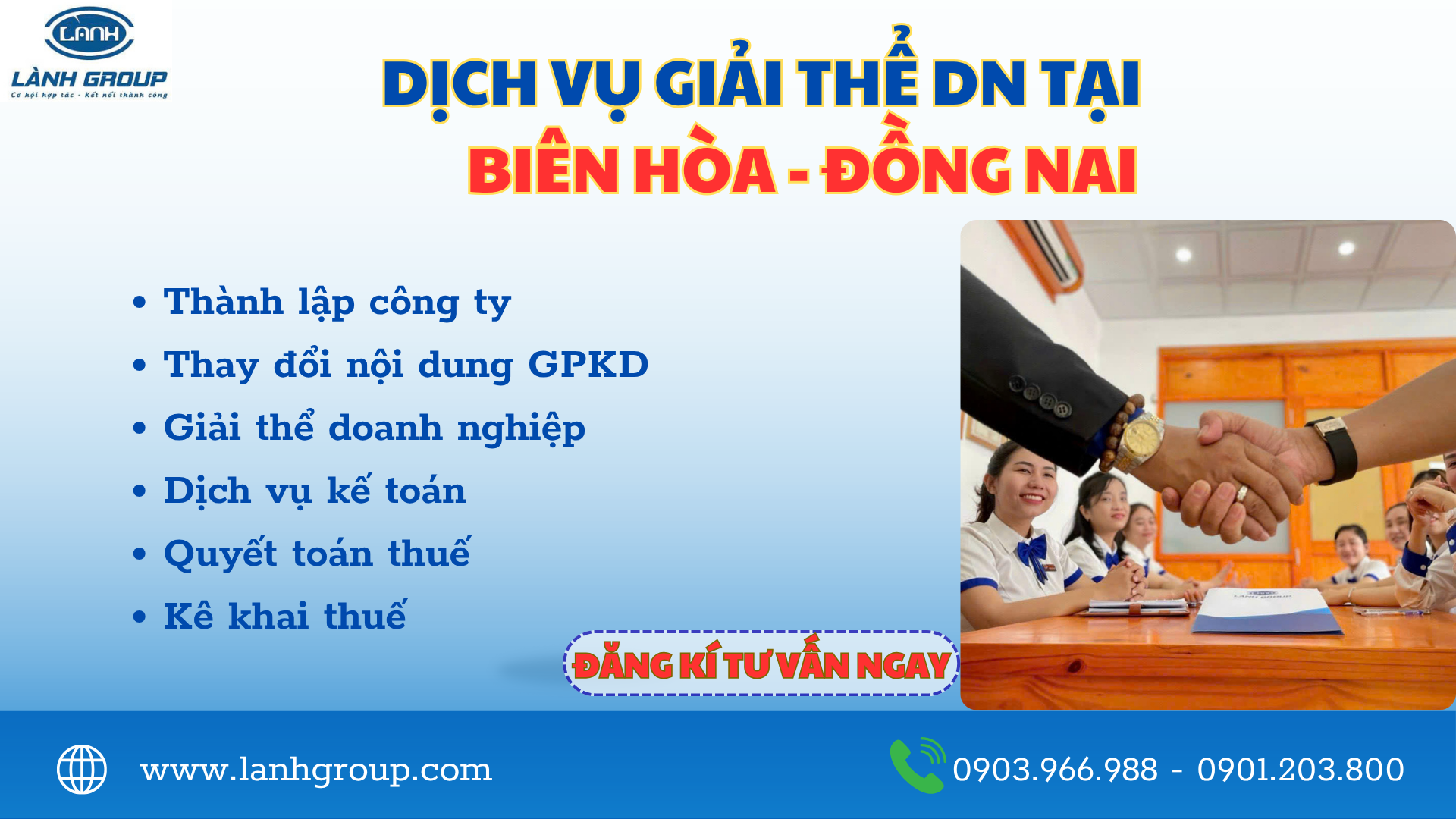 Dịch vụ giải thể doanh nghiệp tại Biên Hòa, Đồng Nai uy tín – Lành Group Biên Hòa hỗ trợ trọn gói hồ sơ, thủ tục, khóa mã số thuế, quyết toán, trả con dấu nhanh chóng.