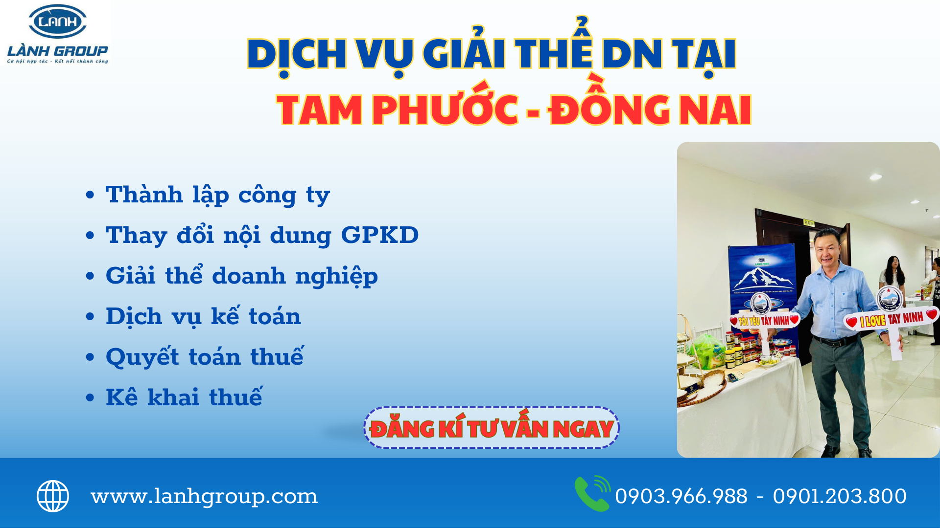 Nếu bạn đang tìm kiếm dịch vụ giải thể doanh nghiệp uy tín tại Tam Phước, Đồng Nai, Lành Group Biên Hòa là đối tác đáng tin cậy, đồng hành cùng bạn từ tư vấn, soạn hồ sơ, nộp hồ sơ đến nhận giấy chứng nhận giải thể.